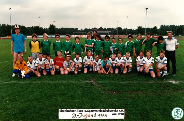 | Jens Lund Nielsen tidligere formand og æresmedlem i Tåsinge forenede Boldklubber havde tilbage i midten af 1980´erne et kort visit som spiller i den tyske klub Eisenbahner Turn und Sportverein Kirchweyhe i nærheden af Bremen. En lille bredde fodboldklub, som minder utrolig meget om TfB med det sociale og børnefodbold i højsædet. Jens Lund faldt hurtigt til rette i det hyggelige klubhus med borde og bænke i solidt mørkt træ og hen over en stor tysk karrypølse og et stort krus øl, blev Jens Lund og repræsentanter fra Kirchweyhe enige om at danne venskab klubberne i mellem. I 1988 drog to drengehold og en enkelt pige Line Mølgaard (årgang 1976, 1977. 1978 & 1979) med bus fra Tåsinge til Bremen, Efter det obligatoriske stop ved den dansk/tyske grænse og endnu et planlagt stop ved et udendørs vandland omkring Hamborg (det var meget koldt) på vej mod destinationen lykkedes fredag aften at ramme Kirchweyhe. Spillere, trænere og forældre blev indlogeret i en sportshal, hvor vi hele weekenden rådede over masser af plads. Der blev spist slik, drukket sodavand og spillet bilkort i soveposerne på de noget hårde liggeunderlag og ind imellem var der tid til lidt boldspil mellem venner og fjender og det var ikke sjældent en sodavandsflaske blev væltet af en vildt farende fodbold eller basketball. Lørdag stod den på fodboldstævne hele dagen på banerne lige udenfor døren. Et ganske imponerende anlæg, hvor både Tennis og fodbold var samlet på et sted. Hvis jeg ikke husker helt forkert, så blev vi mindste af de ældste rykket ned for at give lidt fysisk styrke til miniputterne (årgang 1978 og 1979), men også fordi det hele var 11 mands og i Danmark spillede miniputter jo stadig 7-mands. Resultaterne mindes jeg ikke, men maden var typisk Tysk med lokal suppe, Sauerkraut og skinke stegt som vildt. På turen hjem om søndagen skulle vi lige i endnu et vandland, men denne gang indendørs, hvilket var en noget større succes og knapt så koldt. Året efter i 1989 var det så Kirchweyhe som kom til Tåsinge i forbindelse med indvielsen af de 2 nye 11- mandsbaner langs Eskærvej mod Troense, men ikke siden har klubberne dyrket Deres venskab. Hvad jeg har kunnet opsnuse, så indgik Kirchweyhe i 1992 klubsamarbejde med SC Weyhe som igen er en samarbejdspartner til Werder Bremen, så måske nogen af de grønklædte spillere på billedet er nuværende Bundesligaspillere for Werder Bremen ? |