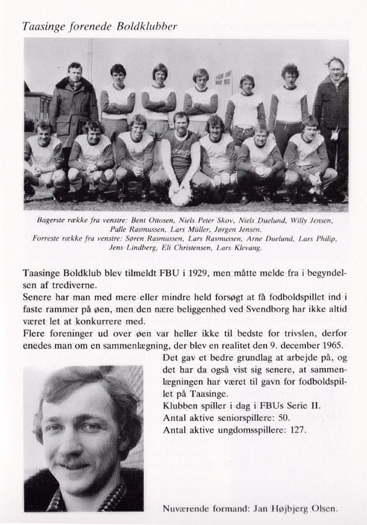 | Tåsinge forenede Boldklubber er resultatet af en sammenlægning af Tåsinge Boldklub og Vindeby Boldklub den 9. december 1965. Rivaliseringen de 2 klubber i mellem har altid været stor på både ungdoms- og seniorniveau. Spillere gik jo i klasse med deres modstandere på henholdsvis Sundhøj Skole og Lundby Skole. Der var tale om lokalopgør af højeste klasse og taktikken blev da også lagt herefter, således blev Jørgen ”Pedel” Pedersen (Tåsinge) altid sat til at skærme Jørgen ”Jussi” Henningsen (Vindeby). Kun SfB havde i Svendborg kommune større ungdomsafdeling end de 2 klubber på Tåsinge, så det var allerede før sammenlægningen 2 slagkraftige og velfungerende klubber. Motivationen for at danne Tåsinge forenede Boldklubber var ambitioner om sportslig succes og en oprykning til Fynsserien. Nøglepersoner som Bengt Hjære Jensen og Jens Højte-Jensen fra Tåsinge BK mødtes med tilsvarende Jørn ”DSB”, Jørgen Henningsen og Eigil Daugaard fra Vindeby for at drøfte visioner og drømme. |