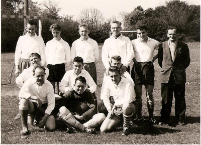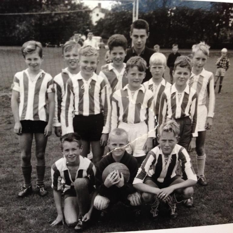 Vindeby boldklub ca. 1963 Man har som noget helt nyt fået spilletrøjer med blå ærmer. Ensartede sokker og shorts er endnu ikke indført. Heller ikke bolde har man øjensynligt for mange af. |